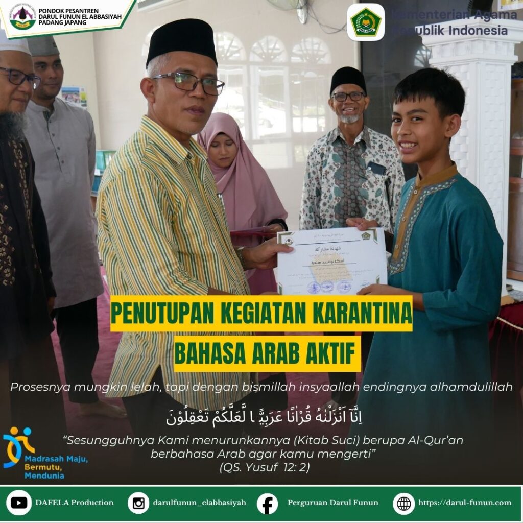 iNFORMASI❗ Sabtu 04 Oktober 2025 Penutupan Karantina Bahasa Arab Aktif Acara Karantina Bahasa Arab Aktif 20 Hari secara resmi ditutup oleh Kasi Pendidikan Pondok Pesantren Bapak H. Safrijon Azwar yang dihadiri oleh Pengurus Yayasan Darul Funun El Abbasiyah, Kepala Madrasah Darul Funun El Abbasiyah, Kepala KUA Kecamatan Guguak, Pengawasan Madrasah, Walisantri Kelas 7(MTs) dan 10